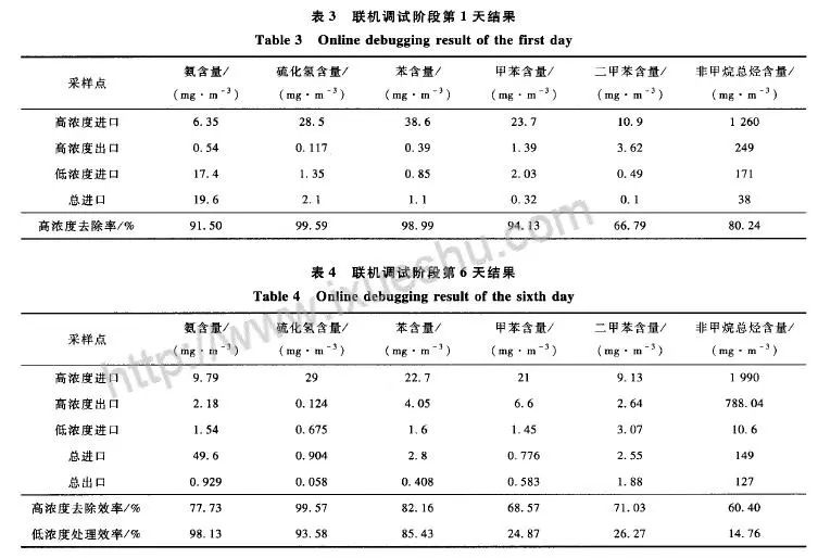 2)采用物理吸附及生物处理技术的复合式工艺,整个处理系统具有减除效果明显、去除率高等优点。其中:活性炭吸附高浓度处理段具有浓度波动适应性强、吸附性能良好等特点¨ ;生物处理装置系统运行不产生二次污染,其最大特点是不仅对颗粒物、油气以及亲水性污染物具有较高的降解力,而且对疏水性污染物也具有较为理想的去除效果,可有效去除硫化氢、氨、有机氮化物、有机硫化物、醛类、醇类、酚类、丙酮、烃类及苯系物等气体。