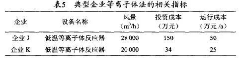 (4)等离子体法。低温等离子体法利用高压脉冲放电获得高能电子、离子和自由基等活性粒子可与VOCs发生作用,将VOCs转化为CO2、H2O等无害或低害物质,从而使废气得到净化。有研究表明,等离子体容易打开C—S和S—H,对于臭味和苯系物的净化均具有良好的效果。等离子体法适宜处理低浓度、大风量的废气,但是实际应用的处理效果一般不超过70%。表5列举了等离子体法处理的相关指标。