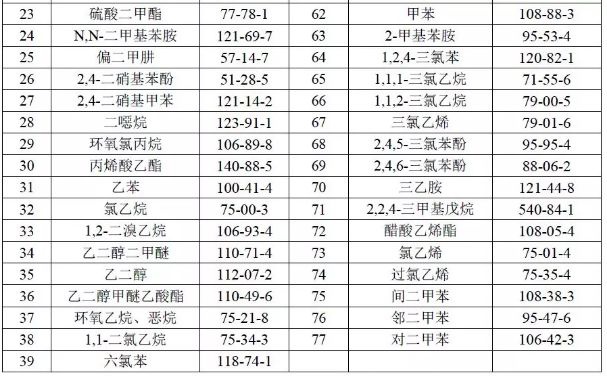 美国制药标准附录中列举了 77 种可能污染大气的有害物质(HAPs),其中有 74 种物质属于美国 HAPs 规定的 189 种之中,只有乙二醇二甲醚、乙二醇和乙二醇甲醚乙酸酯这 3 种制药工业的特征物质不属于 HAPs 名单中的物质。详见下表: