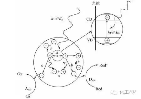 当照射半导体的光能量等于或大于禁带宽度时,其价带电子被激发,跨过禁带进入导带,并在价带中产生相应空穴。电子从价带激发到导带,激发后分离的电子和空穴都有一部分进一步进行反应。