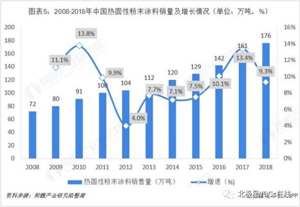 根据中国化工学会涂料涂装专业委员会、全国涂料工业信息中心公布的2018年粉末涂料行业数据统计初步结果显示,2018年我国热固性粉末涂料销量176万吨左右,同比增长9.3%。