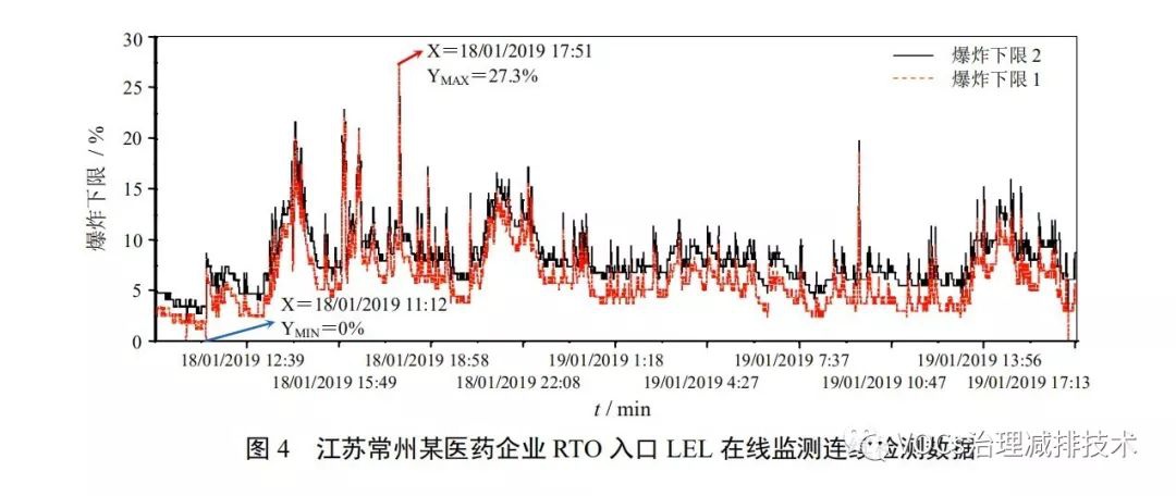RTO系统上应设置LEL在线监测,用于实时监测待净化废气浓度值,当废气浓度瞬时值超过设定安全值后,采取稀释、走旁通等应对措施,避免高浓度废气直接进入RTO炉体从而引发安全事故。LEL在线监测的安装位置和选型应从时效性、准确性等方面考虑,确保RTO系统能够及时、有效的做出应对措施,江苏常州某医药企业RTO入口LEL在线监测连续检测数据如图4所示。由图4检测数据可知,该医药企业废气总管混合废气浓度波动性大,该时间段混合废气浓度峰值在爆炸下限的27.3%,超过爆炸下限的25%,因RTO系统响应及时,避免了安全事故的发生。