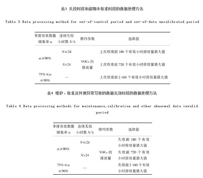数据审核方面,可参照HJ 75提出有效数据捕集率全年必须达75%。失控时段的数据可按照表3中的方法对VOCs排放量进行修约,非甲烷总烃浓度和废气参数不修约。故障期间、维修期间的数据,可使用参比方法监测的数据替代,也可按照表4中的方法对VOCs排放量进行修约,非甲烷总烃浓度和废气参数不修约。当采用参比方法监测的数据替代时,频次不低于每天1次,参比方法的监测过程按照GB/T 16157、HJ/T 397、HJ 732、HJ 38要求进行,替代数据包括非甲烷总烃浓度、废气参数和VOCs排放量。维护保养和校准及其他异常导致的数据无效时段,VOCs排放量按照表4处理,非甲烷总烃浓度和废气参数不修约。