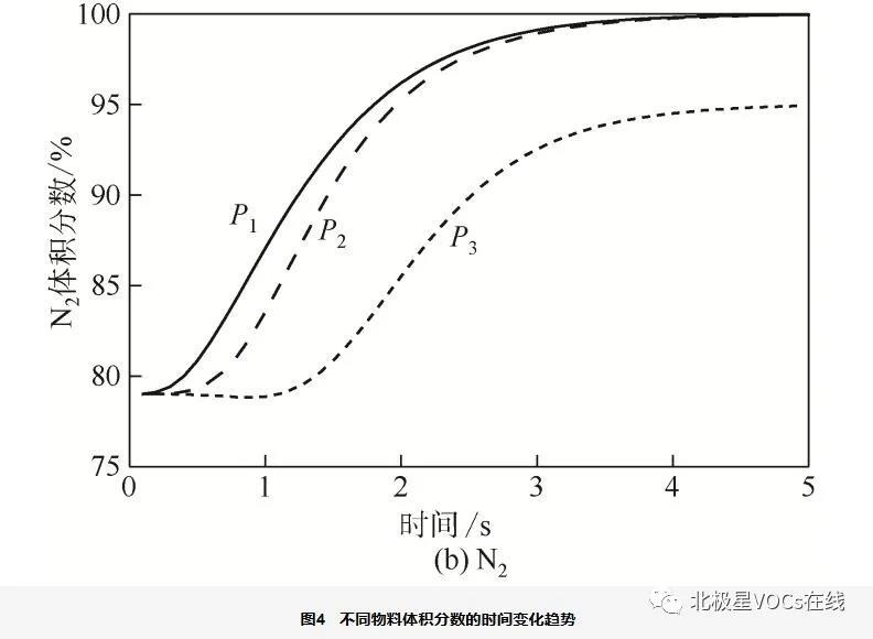 如图4(b)所示,N2为主流气体,浓度逐次、逐步增大,顺序和O2灭失顺序一致。因为N2从VOCs泄漏的上游吹入,VOCs很难进入上游和其对侧绕流区域,这些区域基本被N2逐渐充满,N2体积分数接近100%。在下游区域,N2和VOCs进行混合、携带后流出,因为VOCs占有一定比例,所以P3点的N2体积分数明显低于P1和P2点。