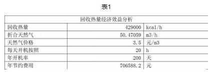表1计算了3条包装线回收的热量为42.9万大卡每小时,按照客户的开机时间计算出来,每年可以节约能源费用70.6万元。