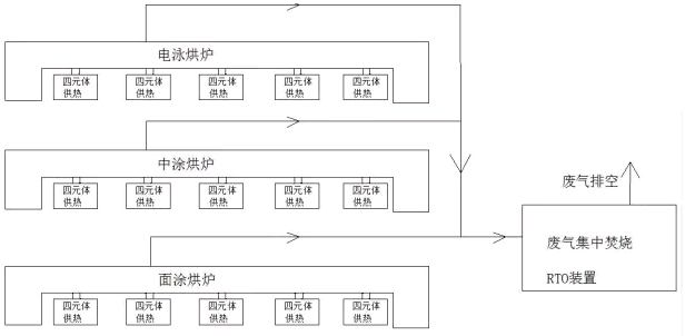 RTO焚烧炉系统是三个烘炉废气集中送至蓄热式RTO焚烧炉焚烧,直接排空,废气排空温度较高。烘干室供热由四元体单独提供。