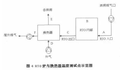 (2)RTO焚烧炉烟气余热回收后排放鉴于RTO炉外排烟气温度较高,可进行烟气余热回收。为此,在RTO炉系统中增设蓄热式高温燃烧炉换热器,由RTO炉排出的烟气与待进入烘房的新鲜外气进行热交换,降低烘房能耗(见图4)。增设了换热器后,测得D点温度为30℃,E点为110℃,F点为90℃。这样就将RTO出口(C点)外排的烟气温度从229℃经热交换回用后下降到90℃(F点)。
