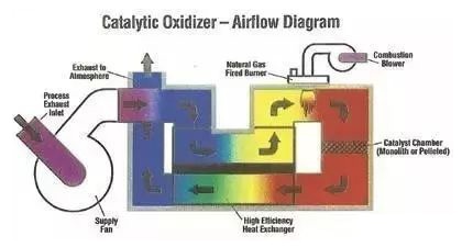 催化剂焚烧炉的设计是依废气风量,VOCs浓度及所需知破坏去除效率而定。操作时含VOCs的废气用系统风机导入系统内的换热器,废气经由换热器管侧而被加热后,再通过燃烧器,这时废气已被加热至催化分解温度,再通过催化剂床,催化分解会释放热能,而VOCs被分解为二氧化碳及水气。之后此一热且经净化气体进入换热器之壳侧将管侧未经处理的VOC废气加热,此换热器会减少能源的消耗,最后,净化后的气体从烟囱排到大气中。