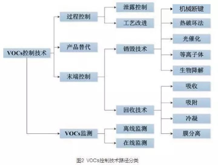 根据大气中 VOCs 产生的原理和 VOCs 的理化性质,其控制技术可以分为两大类,过程控制和末端控制。过程控制是针对 VOCs 的生产过程,从 VOCs 的原理上减少 VOCs 的产生,一般通过工艺提升、技术改造和泄漏控制来实现。末端控制则是针对 VOCs 的化学特性,着力于 VOCs 废气的治理,利用燃烧、分解等方法来控制 VOCs 的排放。