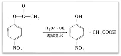 在微气泡溃灭过程中,形成超临界水,有利于提高大多数化学反应速度,例如低挥发性溶质如对硝基苯乙酸酯在瞬时超临界水相的反应如下图:
