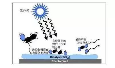原理:光催化剂纳米粒子在一定波长的光线照射下受激生产电子空穴对,空穴分解催化剂表面吸附的水产生氢氧自由基,电子使其周围的氧还原成活性离子氧,从而具备极强的氧化还原能力,将光催化剂表面的各种污染物摧毁。