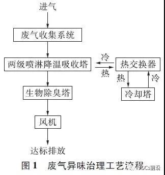 为了达到对尾气降温的目的,也可以采用另一种降温工艺措施,即对尾气收集后直接进入板式换热器进行水气热交换,然后喷淋调节pH并对异味进行初步去除后进入生物塔处理后高空排放。