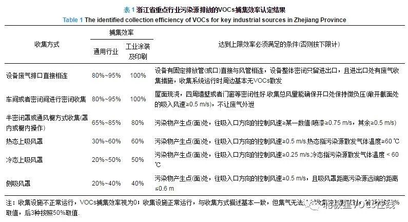 表 1浙江省重点行业污染源排放的VOCs捕集效率认定结果
