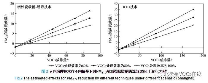 图 2给出了活性炭吸附-脱附、蓄热式热氧化技术对PM2.5削减贡献量的分析情况(基于上海市70%电能来自市内火电厂提供),结果显示,只有当PM2.5削减贡献量超过一定量时才会使PM2.5减排的综合环境效益为正效应.由于各地区能源结构不同,得到的综合环境效益可能也不同.尽管如此,这种综合环境效益分析的结果对于VOCs治理措施的选择是非常重要的.无论是企业还是地方主管部门在选择VOCs治理技术或者推荐技术时,都需要考虑分析其综合环境效益.