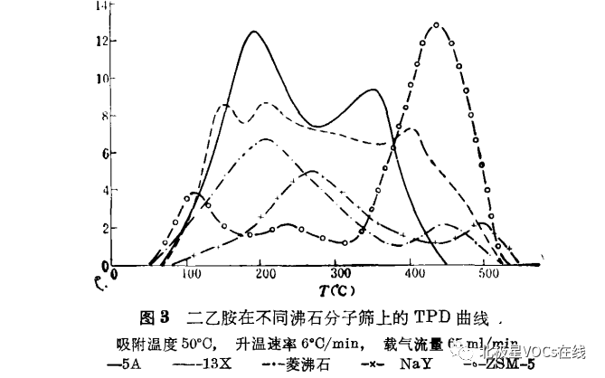 4 . 二乙胺从沸石分子筛表面脱出时, 脱附动力学与晶内扩散有关,其表观脱附活化能分别为75.4kJ/mol( 5A ) 、51.5kJ/mol (13X)、23.2kJ/mol(菱沸石) 、35.6kJ /mol(NaY) 和 5 6.9 k J/mol( ZSM-5 )。