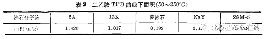 二乙胺在不同的沸石分子筛上的T P D曲线如图 3 所示,可以看出,二乙胺作为一种碱性物质 , 在沸石分子筛表面吸附时, 因存在多种酸性吸附位 , 从而表现出较为复杂的情况,考虑到交联温度一般不应超过250°C, 故以此为界对其进行讨论,实验发现 , 在250°C以前 , 二乙胺在各沸石分子筛上均未有分解现象,T P D曲线在250°C以前的面积数据见表 2 . 从中不难看出二乙胺在沸石分子筛上的吸附量亦随其硅铝比的下降而增加. 参考所用沸石分子筛的有效孔径数据 , 并利用孔径与比表面积之间的定量关系,发现二乙胺的吸附量与各沸石分子筛的比表面积之间无明显的关联关系。结合探针分子在不同沸石分子筛上TPD 实验中各脱附峰的位置 , 可认为各沸石分子筛对二乙胺的有效吸附位是一与表面酸性有关的弱化学吸附。