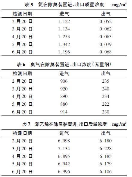 连续半年的监测数据表明,硫化氢的去除率平均达到97. 02%,最高为97. 41%; 氨的平均去除率为94. 66%,最高为95. 37%; 臭气浓度的去除率平均达到74. 26%,最高为74. 84%。但是苯乙烯的去除率平均只为11. 46%,最高为12. 70%。各指标进、出口浓度变化见表4 ~ 表7。