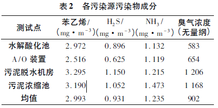 主要考察苯乙烯、H2S、NH3和臭气浓度几个指标,对各臭气排放源进行检测分析,分析结果见表2。