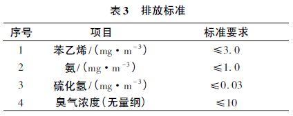 处理后的废气中苯乙烯、硫化氢、氨、臭气浓度执行《恶臭污染物排放标准》( GB 14554—93) 厂界标准值一级标准,见表3。