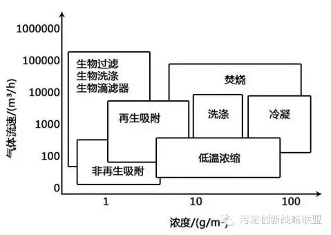 下图为流速和浓度条件下对应的VOC处理工艺的适用范围