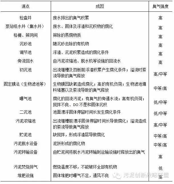 不同的污水处理设施及处理过程散发的恶臭物质也有所不同。一般就污水处理厂来说,其中进水部分(格栅间、进水泵房、沉砂池、调节池、初沉池),厌氧处理部分,污泥处理部分(贮泥池、脱水机房、污泥储存、污泥堆肥、污泥干化)散发的恶臭物质浓度较高,需密闭收集处理。好氧段产生的臭气较少(如曝气池、二沉池),一般无需收集处理。